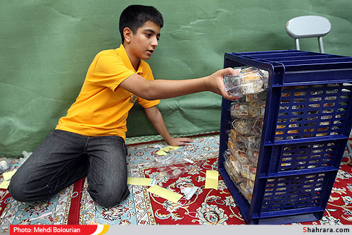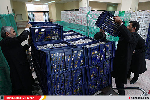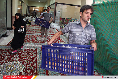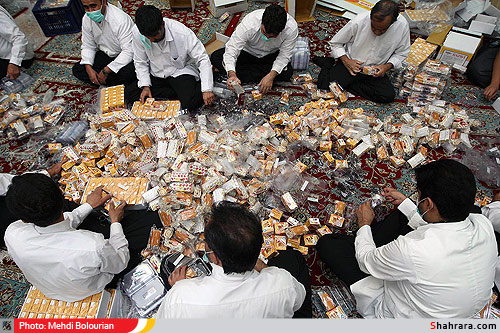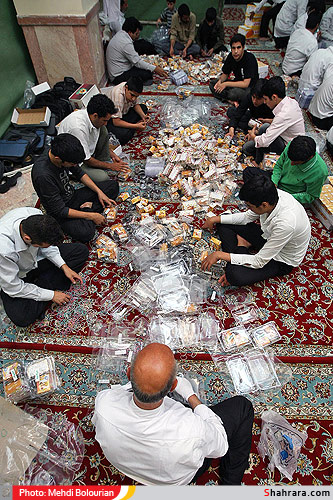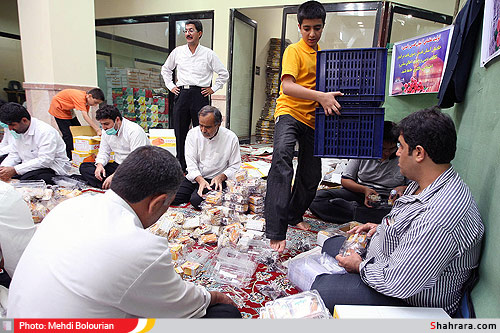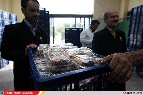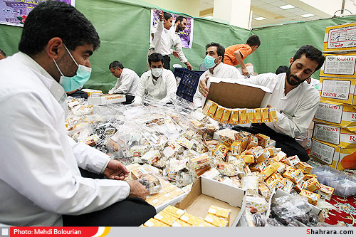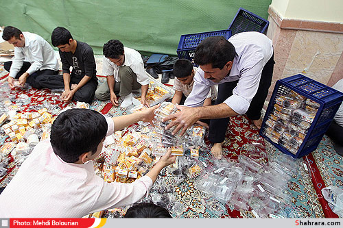 همه روزه در طول ماه مبارک رمضان بسته های افطار بین نمازگراران در حرم امام رضا(ع) توسط خادمین بارگاه رضوی توزیع می شود.