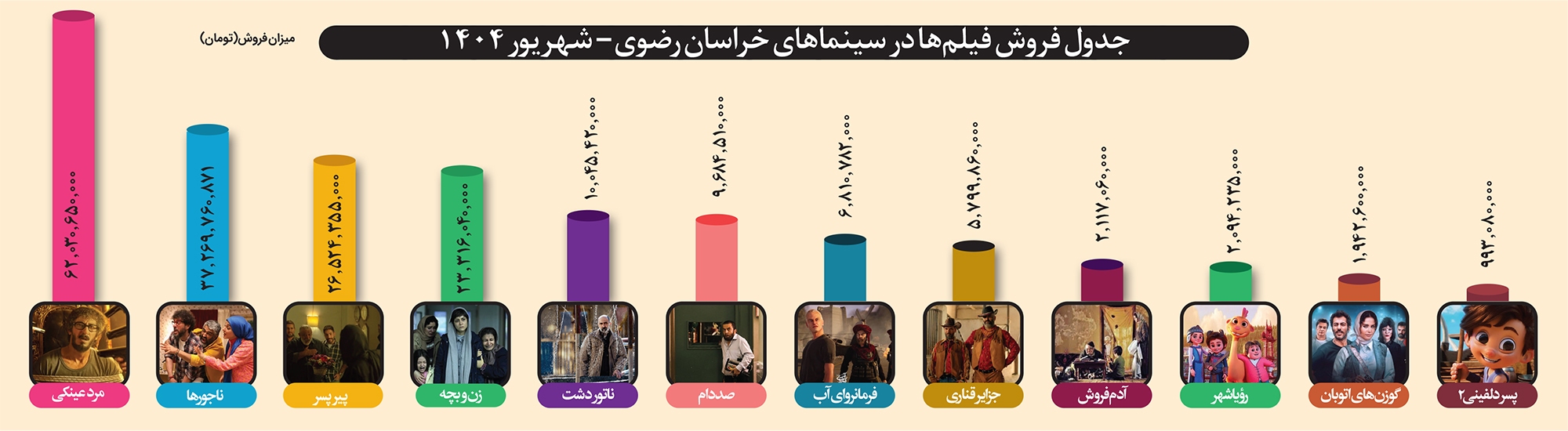 کمدی‌ها در خراسان رضوی طی ۳۱ روز شهریور ۱۴۰۴، ۱۰ میلیارد تومان فروش داشتند و سه فیلم دیگر به مرز ۷ میلیارد تومان رسیدند. این در حالی است که ناتور دشت از دوازدهم شهریور اکران شد و اگر این فیلم از ابتدای ماه روی پرده می‌رفت، فاصله سه میلیاردی میان کمدی‌ها و آثار جدی، حتما کمتر از این میزان می‌شد.