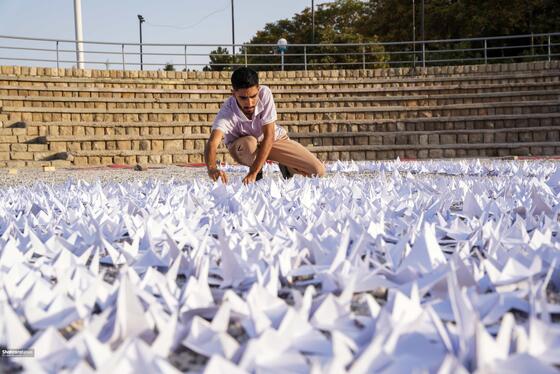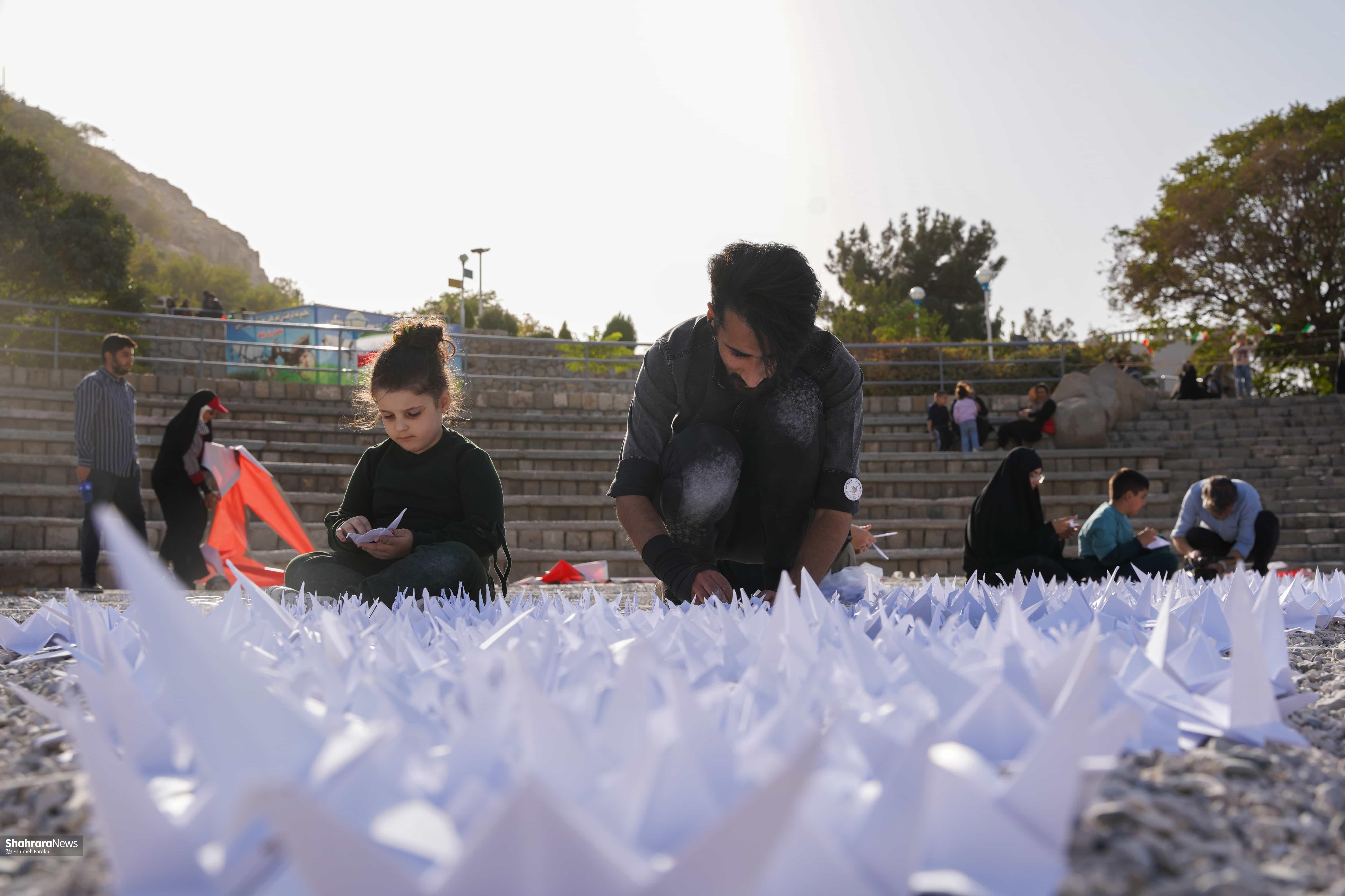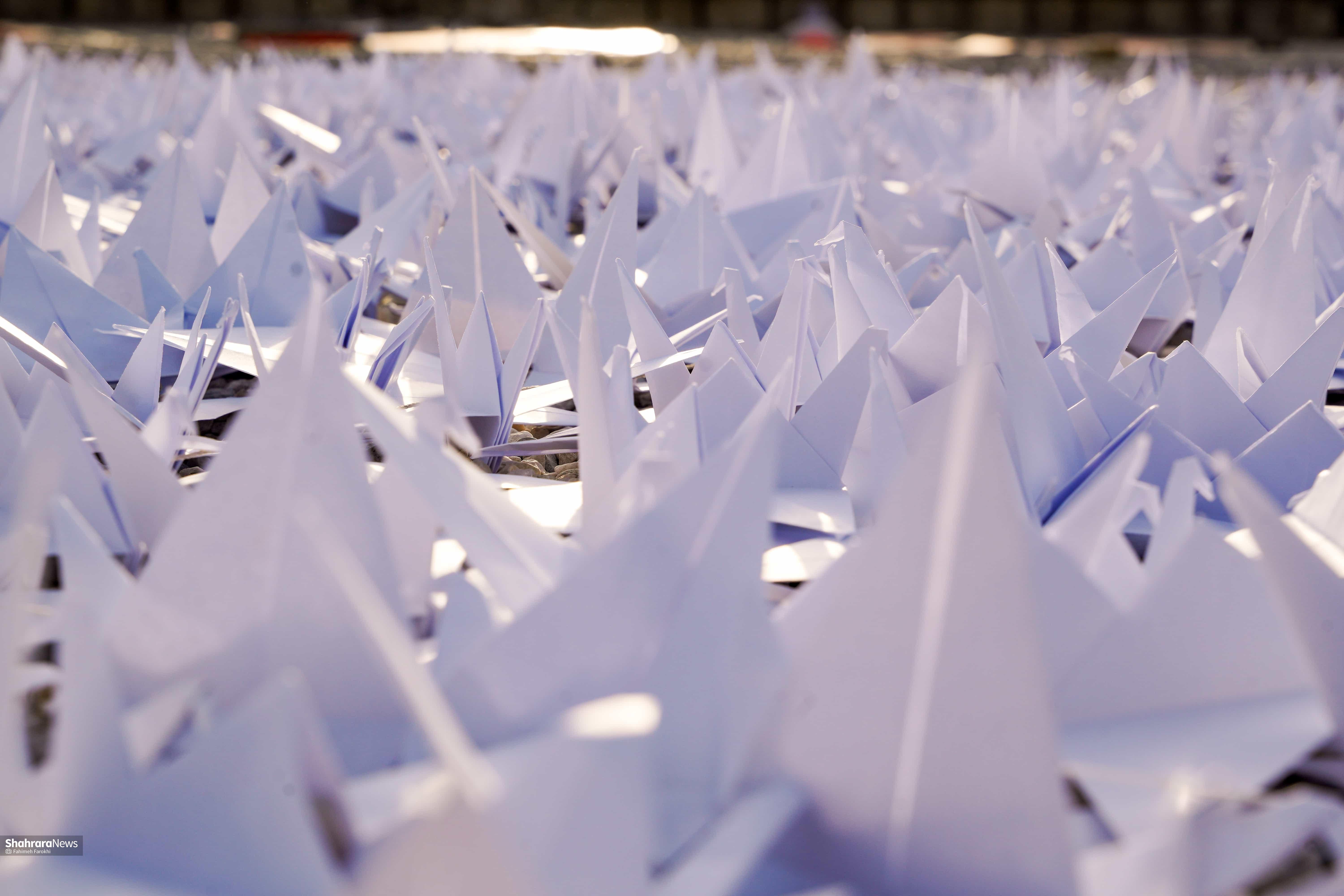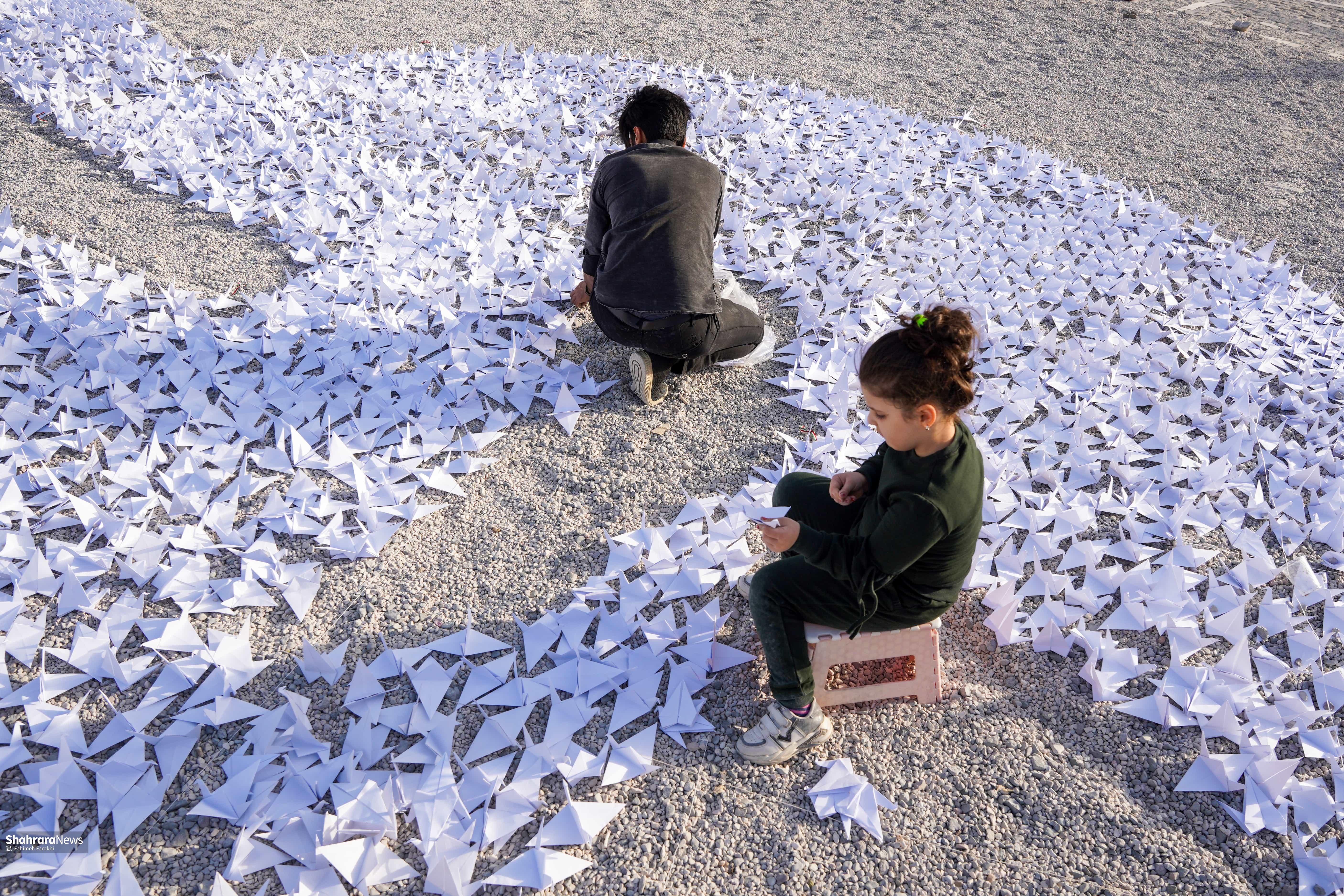 بیش از چهار هزار درنای کاغذی در حمایت از کودکان غزه در پارک کوهسنگی مشهد چیدمان شد.