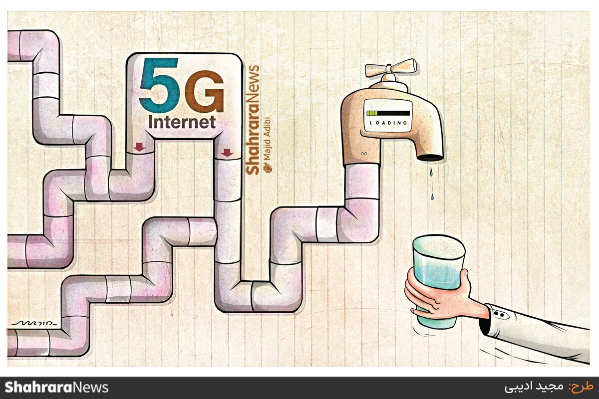 با وجود گلایههای مردمی از کند بودن سرعت اینترنت، مسئولان مخابرات خبر از فعال شدن اینترنت 5G میدهند! منبع: شهرآرا - طرح از مجید ادیبی، کارتونیست روزنامه شهرآرا