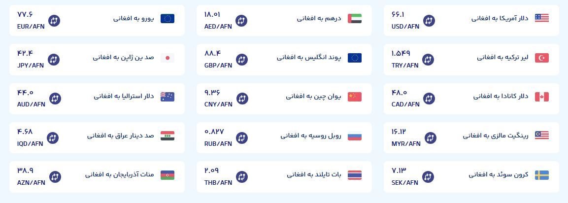 بالاترین قیمت افغانی در ۲۴ ساعت گذشته ۱،۹۰۰ تومان و پایینترین قیمت در رقم ۱،۸۹۵ تومان خرید و فروش میشد. قیمت فعلی افغانی نسبت به هفته گذشته ۳.۲۶ درصد افزایش را نشان میدهد.