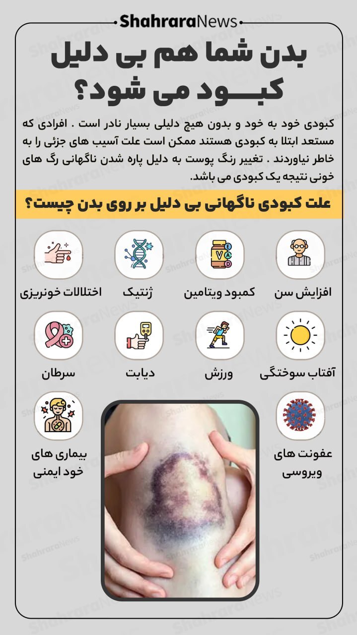 علت کبودی بدن بدون ضربه کبودیهای بدون ضربه میتوانند به دلایل مختلفی از جمله افزایش سن، قرار گرفتن مداوم در معرض نور خورشید، کمبود ویتامینهایی مانند C و K، مصرف داروهای رقیقکننده خون و برخی بیماریهای خونی رخ دهند. با افزایش سن، پوست نازکتر شده و کلاژن کمتری تولید میشود که میتواند به کبودیهای بیدلیل منجر شود.