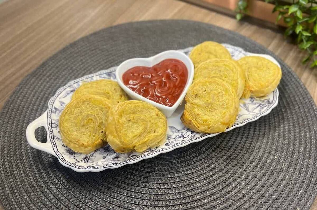در این مرحله، خمیر هزار لایه را روی سطح کار باز کنید، سپس از مواد سیب زمینی روی خمیر بریزید و کاملا صاف و یکدست کنید. خمیر را رول و کاملا فشرده کنید. سپس به اندازه دلخواه برش بزنید و داخل قالب چرب شده بذارید.