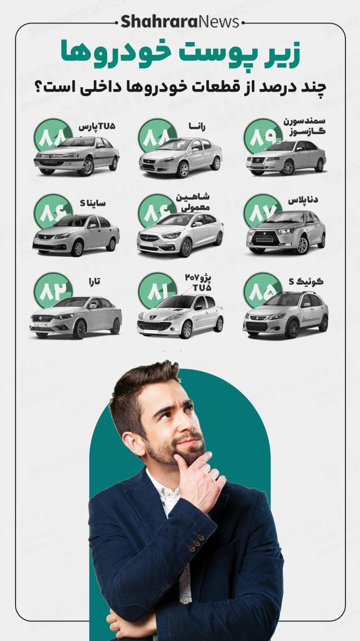در اینفوگرافی نشلن داده است که در ایران چند درصد از قطعات خودروها داخلی است.