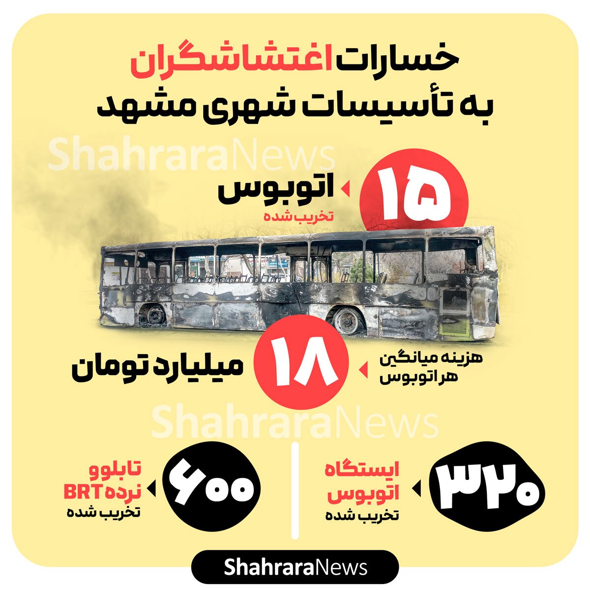 اغتشاشات در مشهد منجر به تخریب ۱۵ اتوبوس شهری، ۳۲۰ ایستگاه اتوبوس و ۶۰۰ تابلو و نرده BTR شده است.