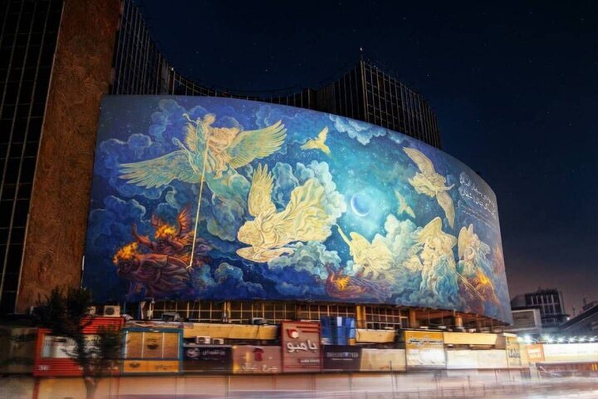 در توضیح دیوارنگاره «بگرفته ملک عنان ز شیطان» قطعه شعری از مصطفی کفائی و سخنی از پیامبر اکرم (ص) آمده است: