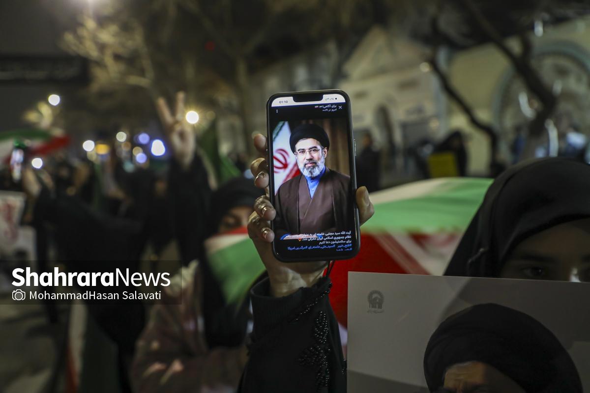 پس از اعلام مجلس خبرنگان رهبری در پی انتخاب حضرت آیت‌الله سید مجتبی حسینی خامنه‌ای، فرزند امام شهید انقلاب، مردم شهیدپرور مشهد مقدس که از هفته گذشته شب‌های متمادی در سطح شهر حضور داشتند به این انتخاب واکنش نشان دادند و بیعت خود را با ایشان اعلام کردند.