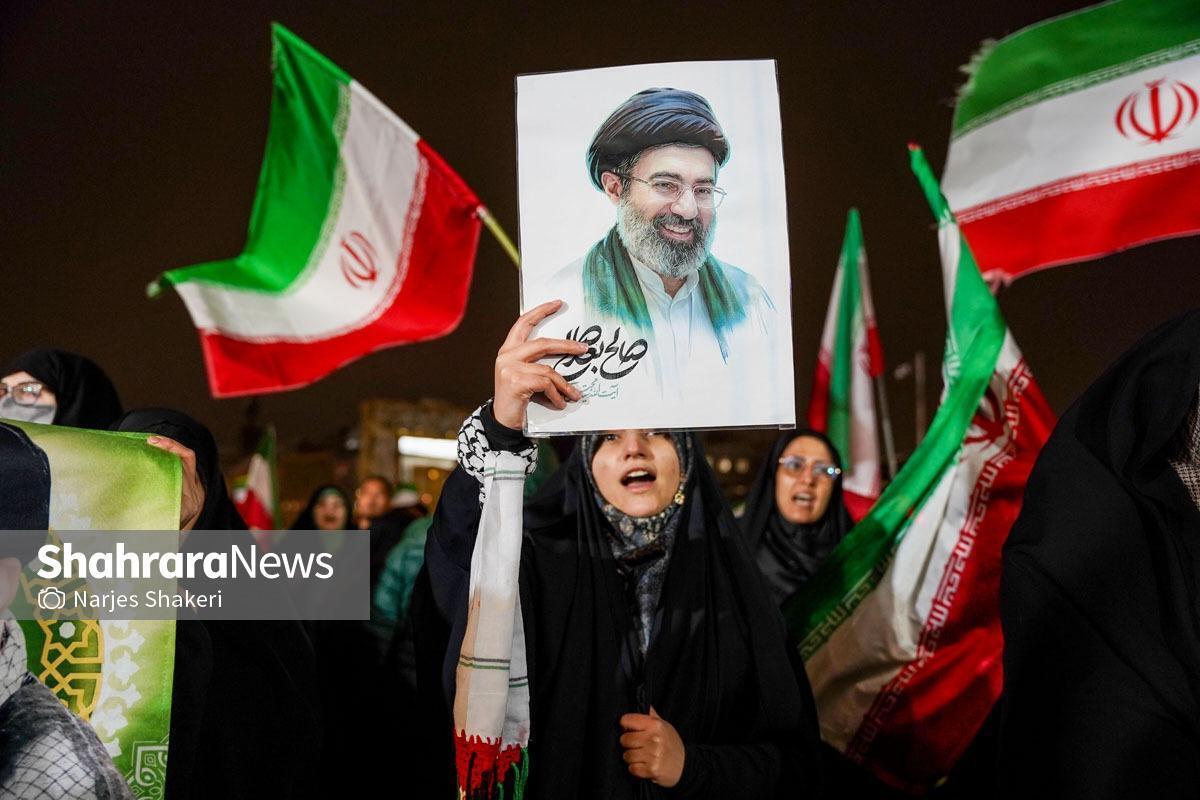 مردم مشهد در سیزدهمین شب از خروش خودجوش، ضمن بیعت با سومین رهبر معظم انقلاب، آیتالله سیدمجتبی خامنهای، به حمایت از نیروهای مسلح پرداختند و صحنههایی تازه از سوگ حماسی را خلق کردند. مشهدیها که امروز همزمان با روز قدس از صبح در خیابانهای شهر مشهد حماسه آفریدند، در شب سردِ شهر هم خیابانها را رها نکردند.