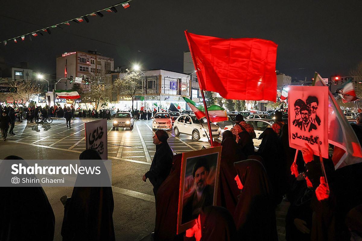 مردم مشهد نیز همراه و همگام با دیگر مردم ایران اسلامی، همچنان در سنگر خیابان حضور دارند و تأکید میکنند که تا انتقام خون رهبر شهید انقلاب اسلامی، سنگر خیابان را رها نمیکنند.
