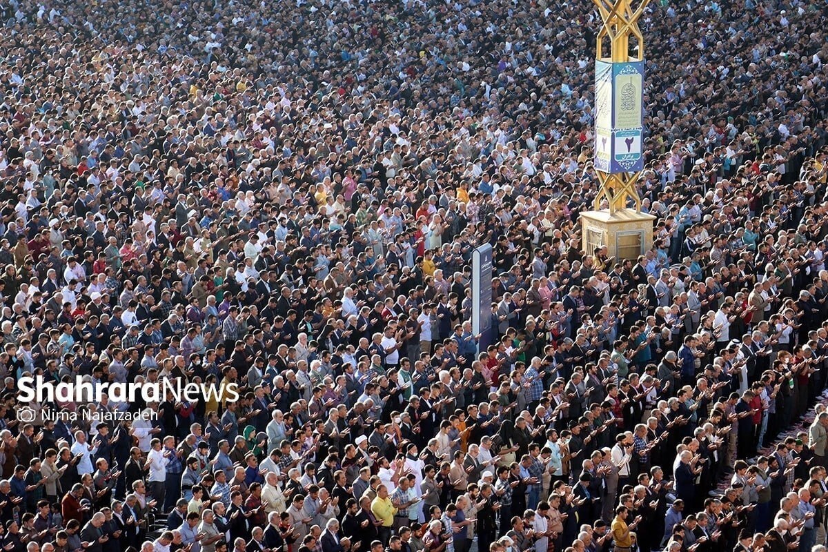 همه آنهایی که صبح امروز به جشن اقامه نماز عید آمدند تا پس از ۲۲ روز جنگ با شیاطین عالم، کام به حلاوت اقامه نماز در محضر سلطان توس شیرین کنند، همان کسانی بودند که یک ماه، کام از انواع اطعمه و اشربه بسته بودند، آتش کینه ابلیس‌زادگان پلید را بر سر دیدند، عزیز از دست دادند و بازهم ۲۱ شب در کف خیابان‌ها، امنیت میهن را با دست خالی پاسداری کردند. همان‌ها حالا با پایان آزمون بزرگ پروردگار در ماه بندگی، به آغوش امام مهربان پناه آوردند، صورت به خنکای نسیم صبحگاهی در صحن‌های حرم مطهر رضوی سپردند و روح در این دریا شستند.
