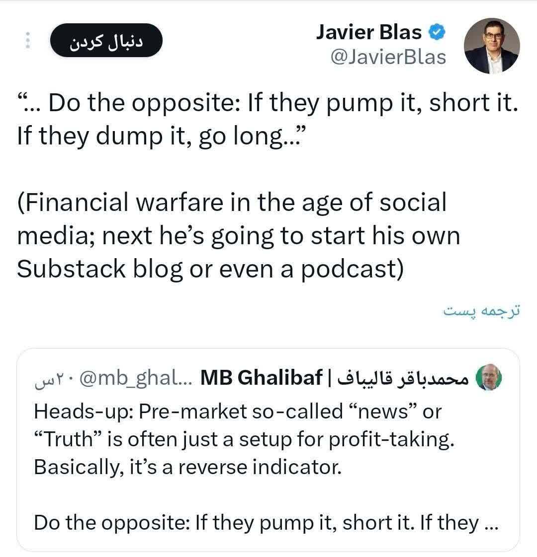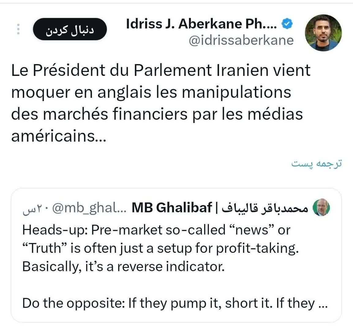 به گزارش شهرآرانیوز؛ ساعتی قبل از بازشدن بازار‌های جهانی و اعلام قیمت‌ها، محمدباقر قالیباف در توئیتی به زبان انگلیسی و البته تخصصی خطاب به فعالان اقتصادی متنی نوشت که به زبان ساده و قابل فهم چنین بود: