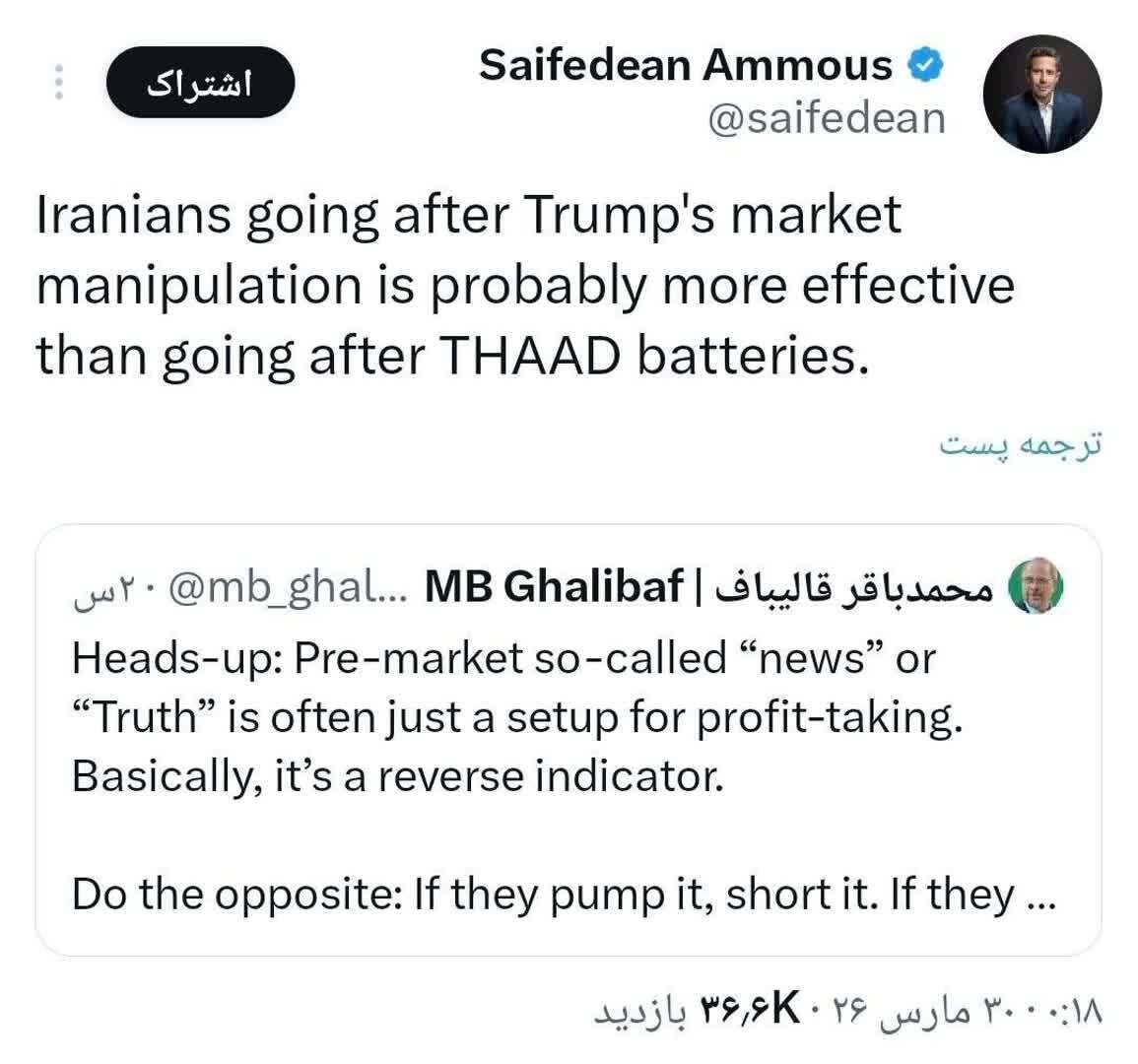 برای مثال سیف الدین عموص، دستیار جفری ساکس، تحلیلگر بازار بیتکوین و دکتری اقتصاد توسعه از دانشگاه کلمبیا نوشت: "مقابله ایرانی‌ها با دستکاری بازار توسط ترامپ احتمالا موثرتر از مقابله با باتری‌های تاد است. "