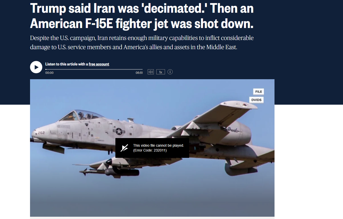 «پس از ۳۷ بار شکست متوالی ایران، این جنگ درخشان و بدون استراتژی که آنها آغاز کردند، اکنون از «تغییر رژیم» به «هی! کسی میتواند خلبانان ما را پیدا کند؟ لطفا؟» تنزل یافته است. چه پیشرفت باورنکردنی. نابغههای تمامعیار.» یکی از اعضای ارتش همچنان مفقود است.