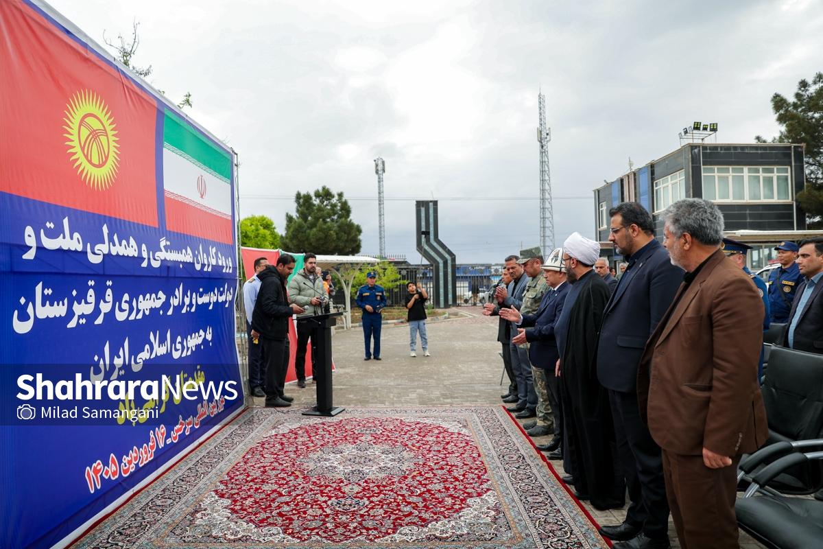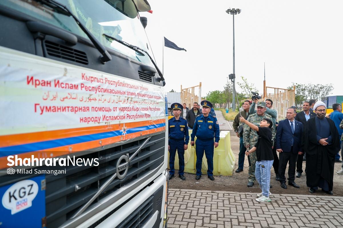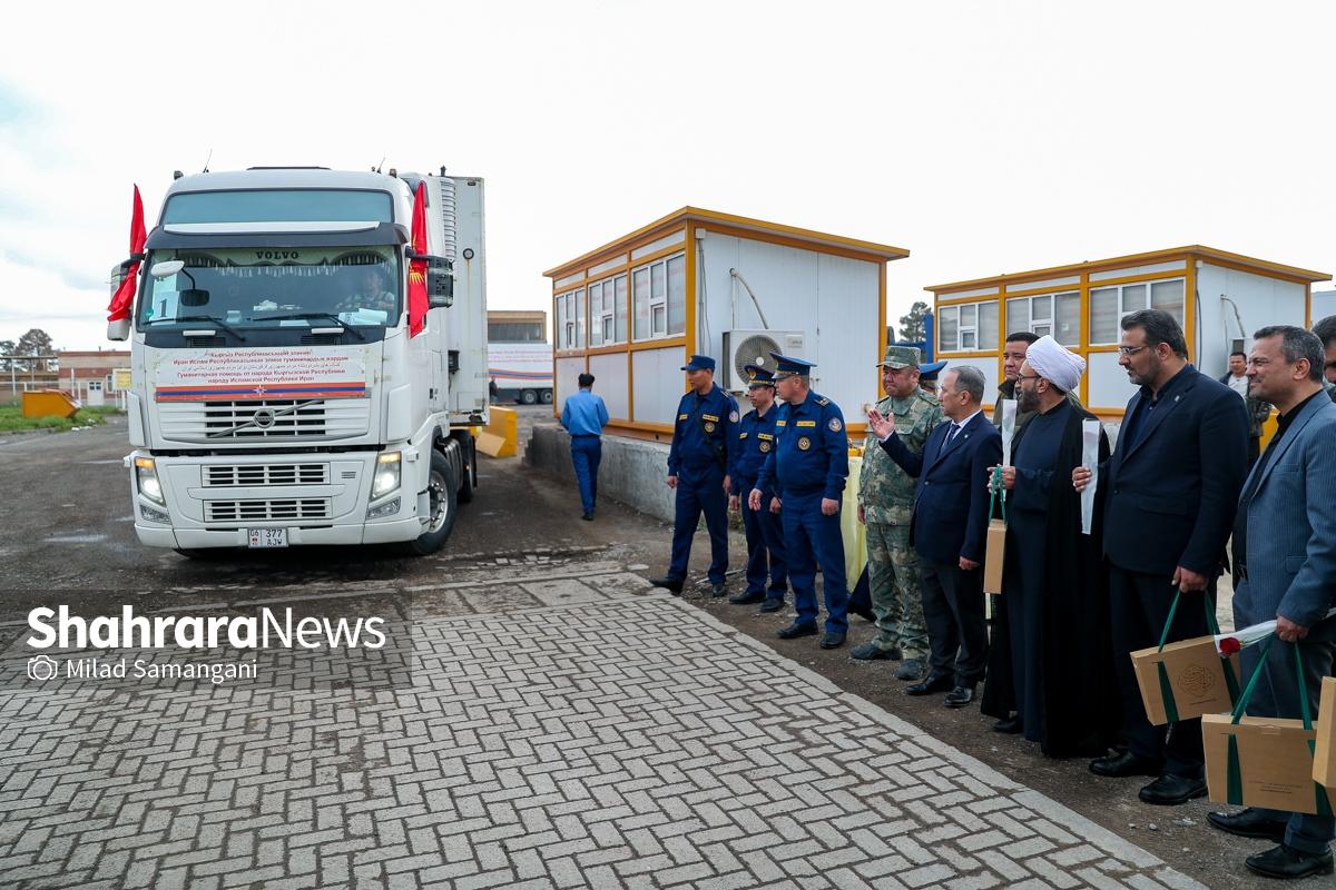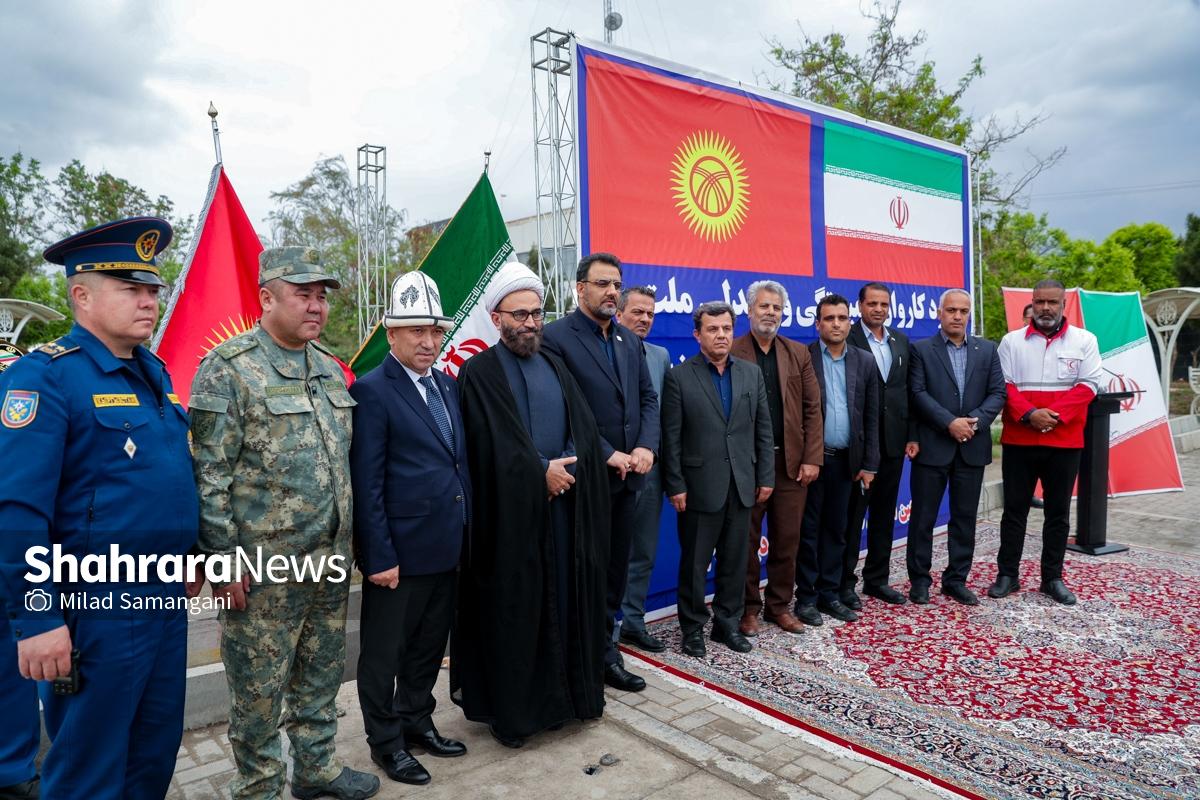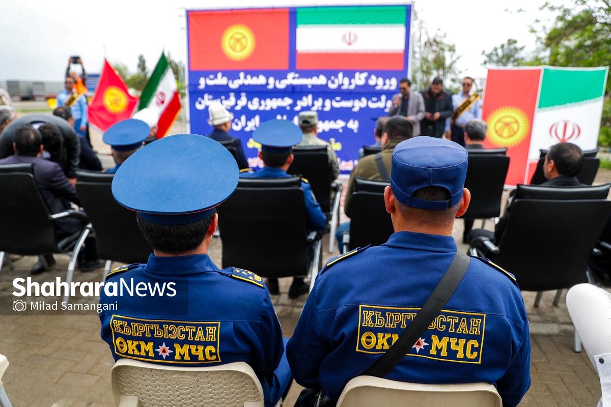 این کاروان شامل ۷ تریلی محصولات غذایی، دارویی و لوازم پزشکی و اقلام ضروری می‌باشد که با حضور کیلیچوف عاقل بیک سفیر جمهوری قرقیزستان در ایران، آسانوف آلماز بیک معاون وزیر حوادث جمهوری قرقیزستان و تعدادی دیگر از مسئولین این کشور طی مراسمی در پایانه مرزی سرخس، تحویل مقامات جمهوری اسلامی ایران شد.