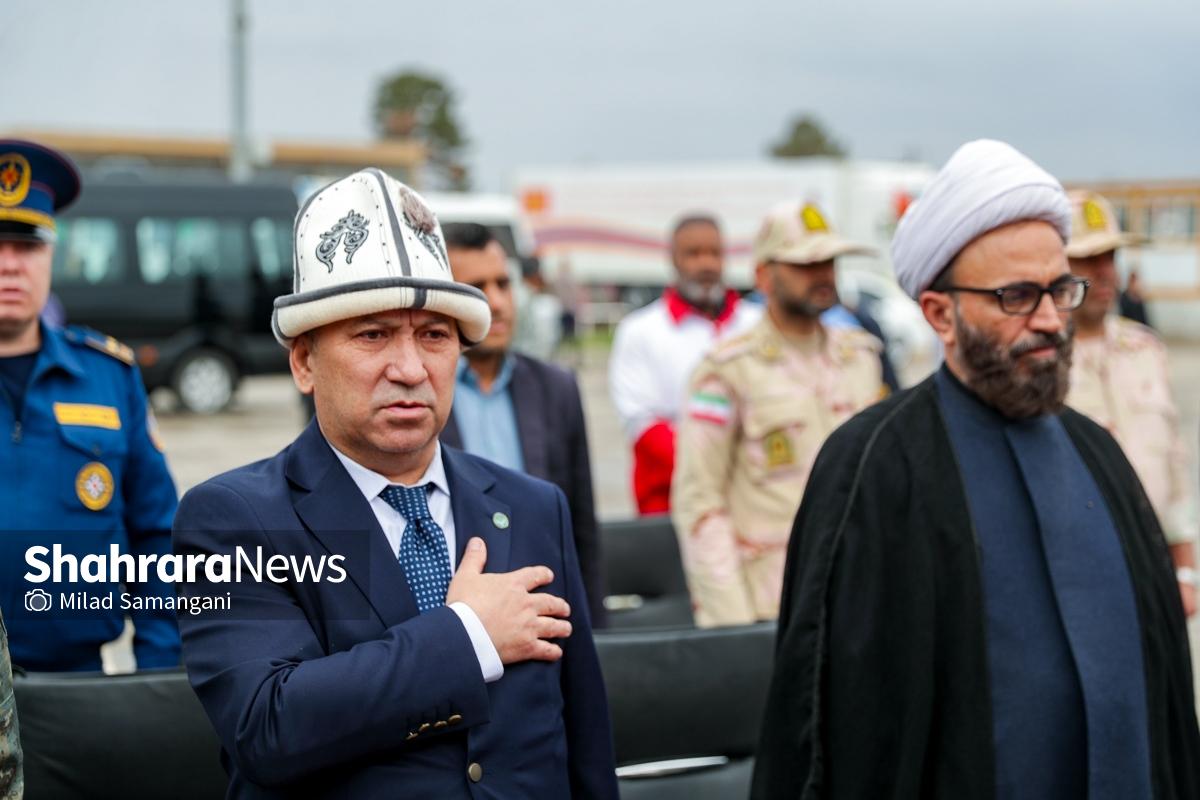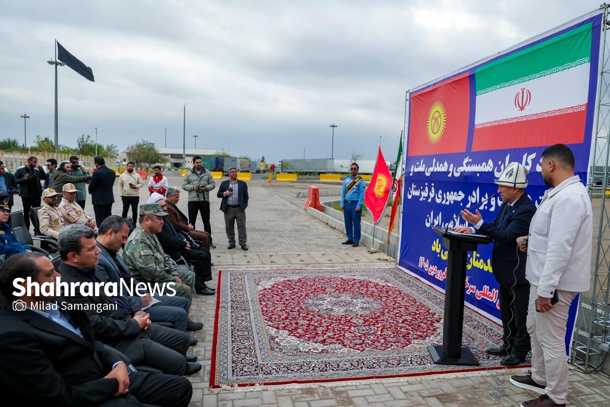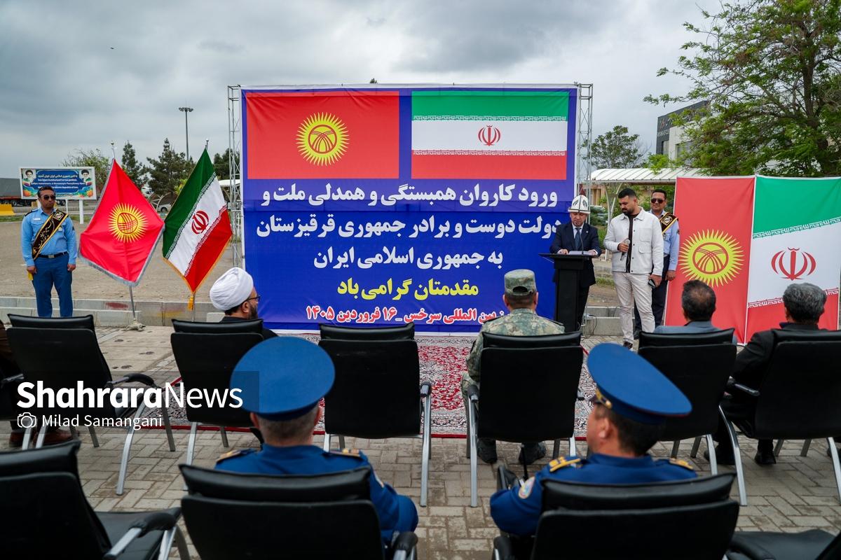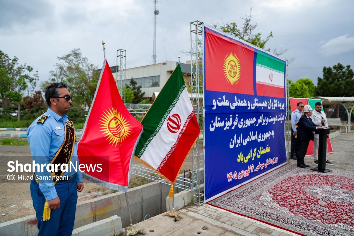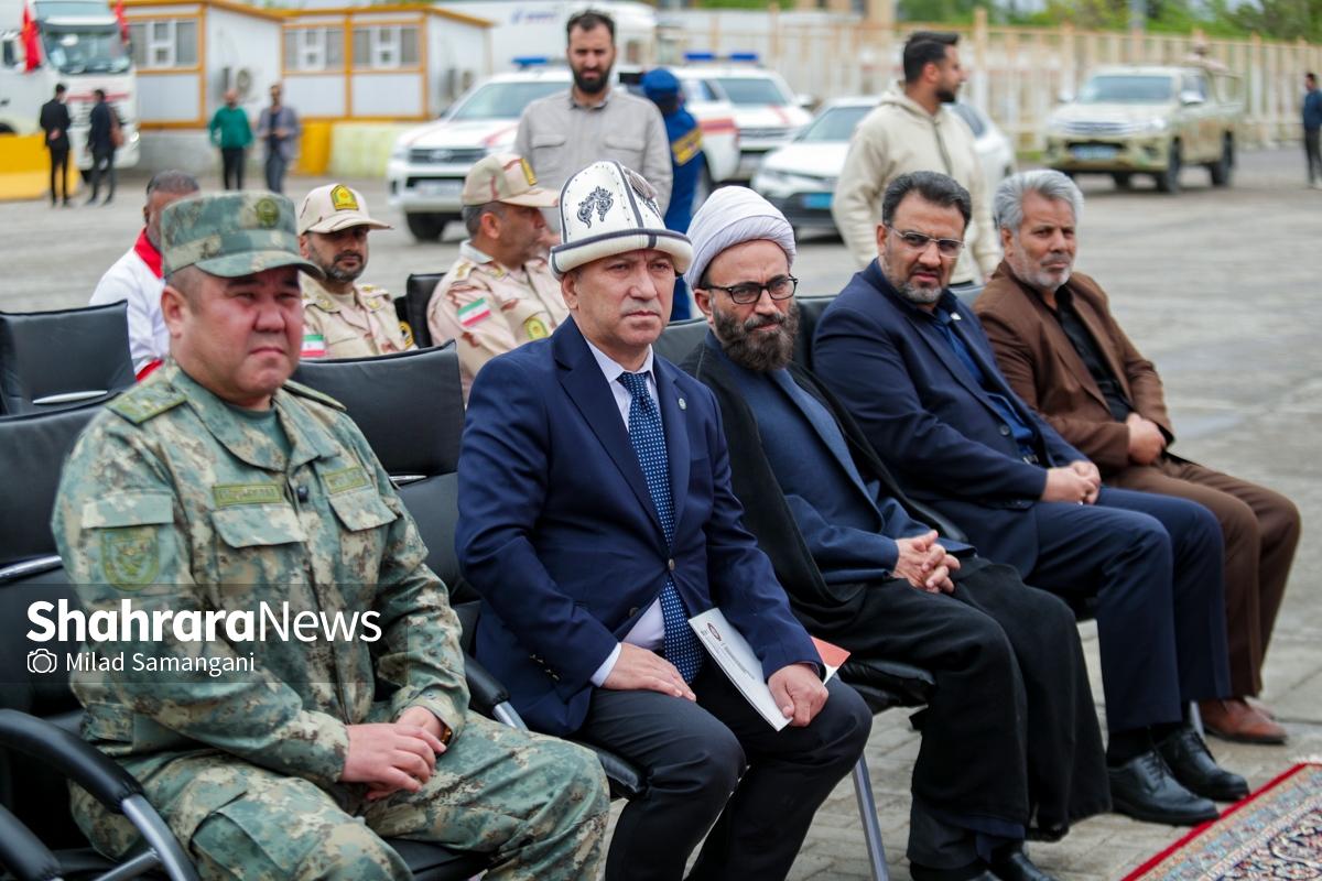 این کاروان شامل ۷ تریلی محصولات غذایی، دارویی و لوازم پزشکی و اقلام ضروری می‌باشد که با حضور کیلیچوف عاقل بیک سفیر جمهوری قرقیزستان در ایران، آسانوف آلماز بیک معاون وزیر حوادث جمهوری قرقیزستان و تعدادی دیگر از مسئولین این کشور طی مراسمی در پایانه مرزی سرخس، تحویل مقامات جمهوری اسلامی ایران شد.