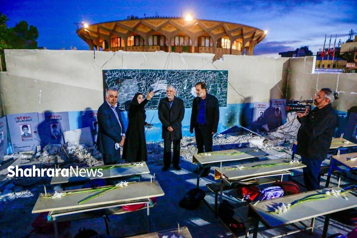از جمله بخشهای این برنامه، بازسازی نمادین کلاس درس کودکان مینابی بود؛ فضایی که با رویکردی هنرمندانه، به بازنمایی زیست ناتمام کودکانی پرداخت که قربانی یکی از تلخترین فجایع معاصر به دست آمریکاییها و صهیونیستها شدند.