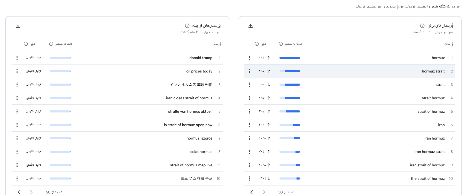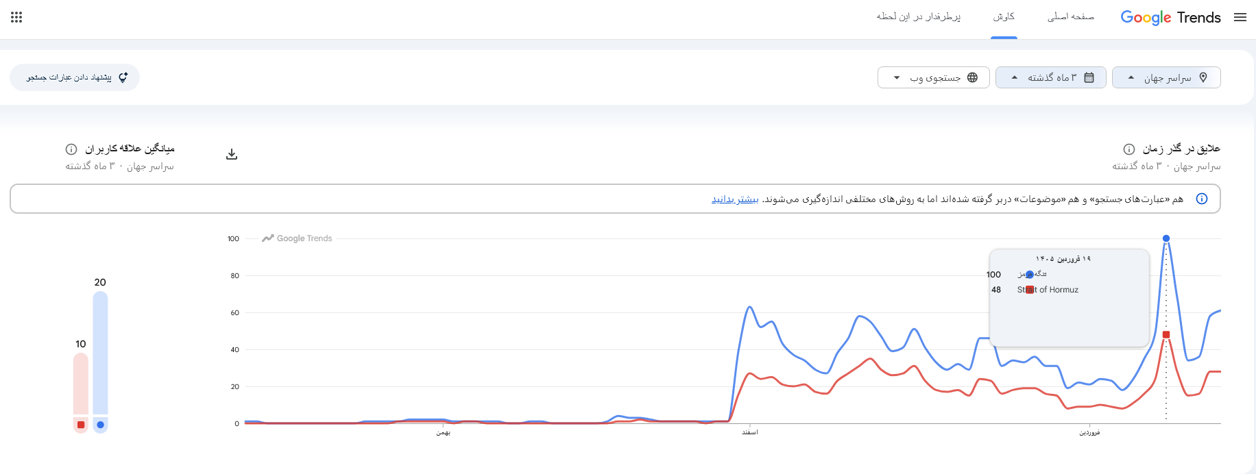همچنین در همین بازه زمانی، جستوجوی عبارت «تنگه هرمز» نیز رشد قابل توجهی را تجربه کرده و به بالاترین سطح خود در سالهای اخیر رسیده است؛ بهگونهای که از زمان جنگ ۱۲ روزه نیز فراتر رفته است.