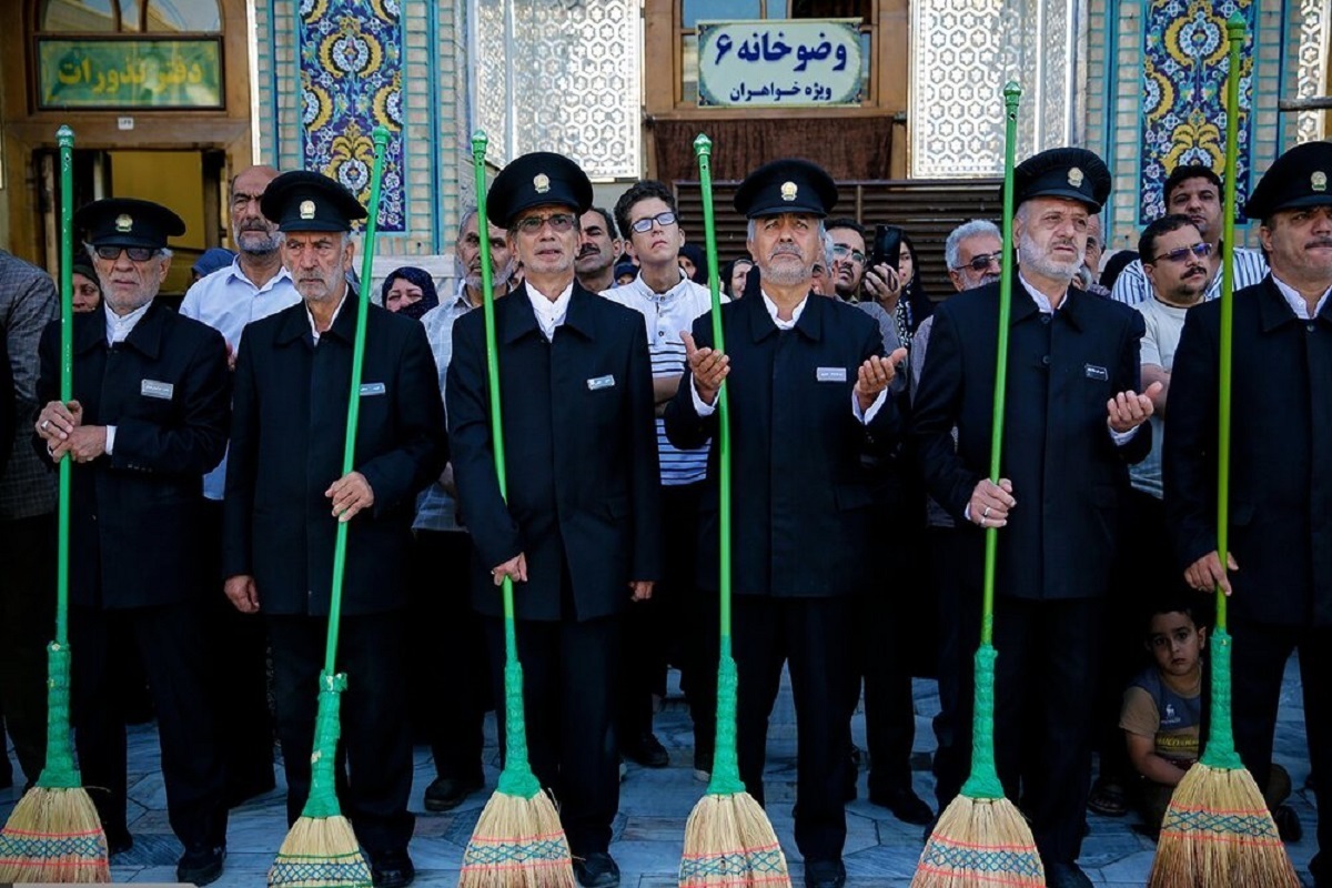 به گزارش شهرآرانیوز، هفدهمین آیین اعطای احکام خدمه با حضور جمعی از مدیران و حدود ۴۰۰ نفر از خادمان بارگاه منور رضوی در تالار ولایت حرم مطهر برگزار شد و احکام خدمت ۱۵۳ نفر از خدمه خواهر و برادر در بخشهای مختلف خدمتی شامل خدام، فراشان، کفشداران، دربانان و حفاظ حرم مطهر رضوی اعطا شد.