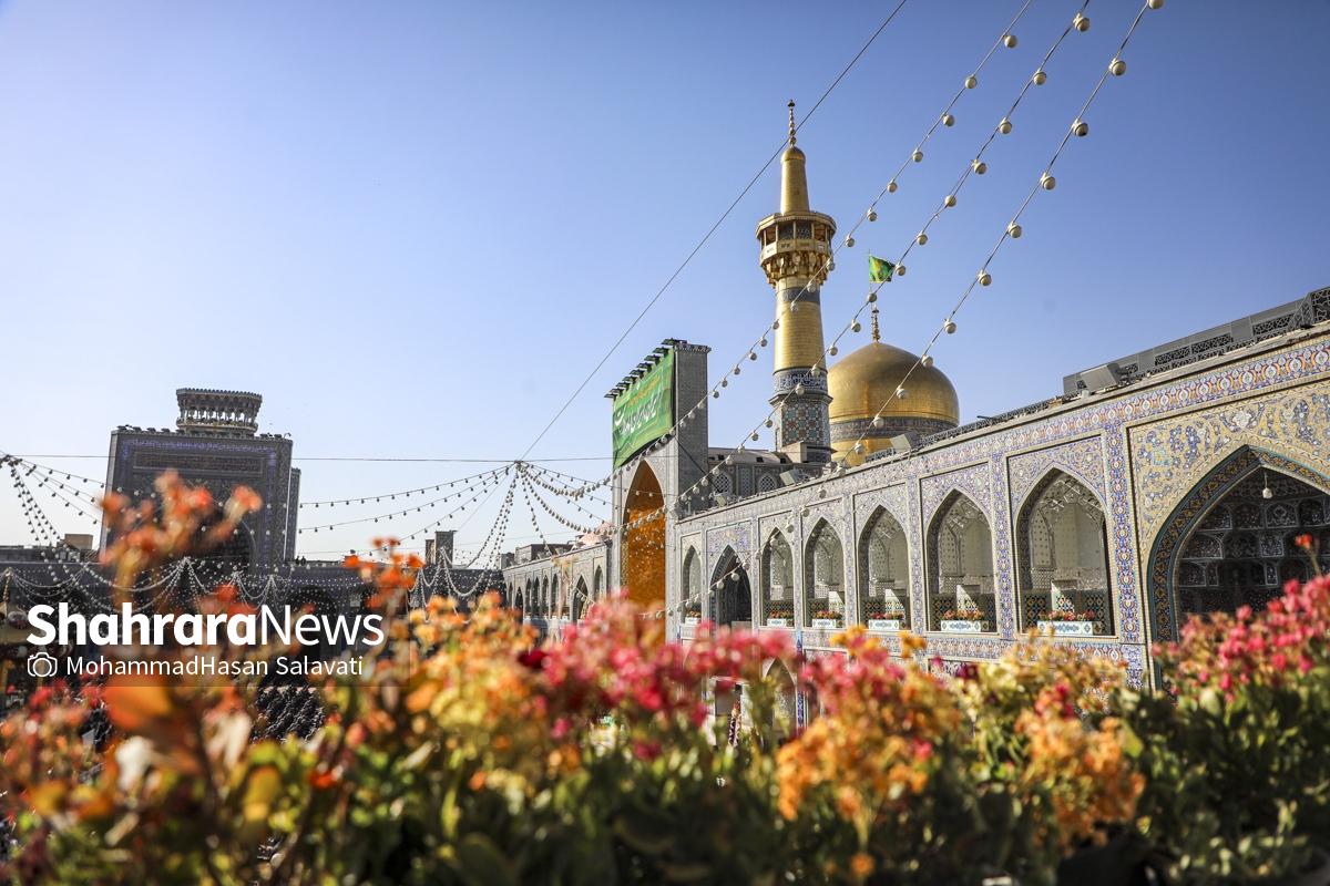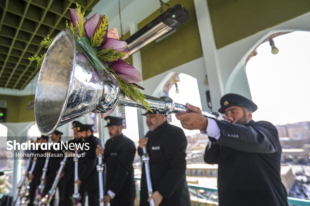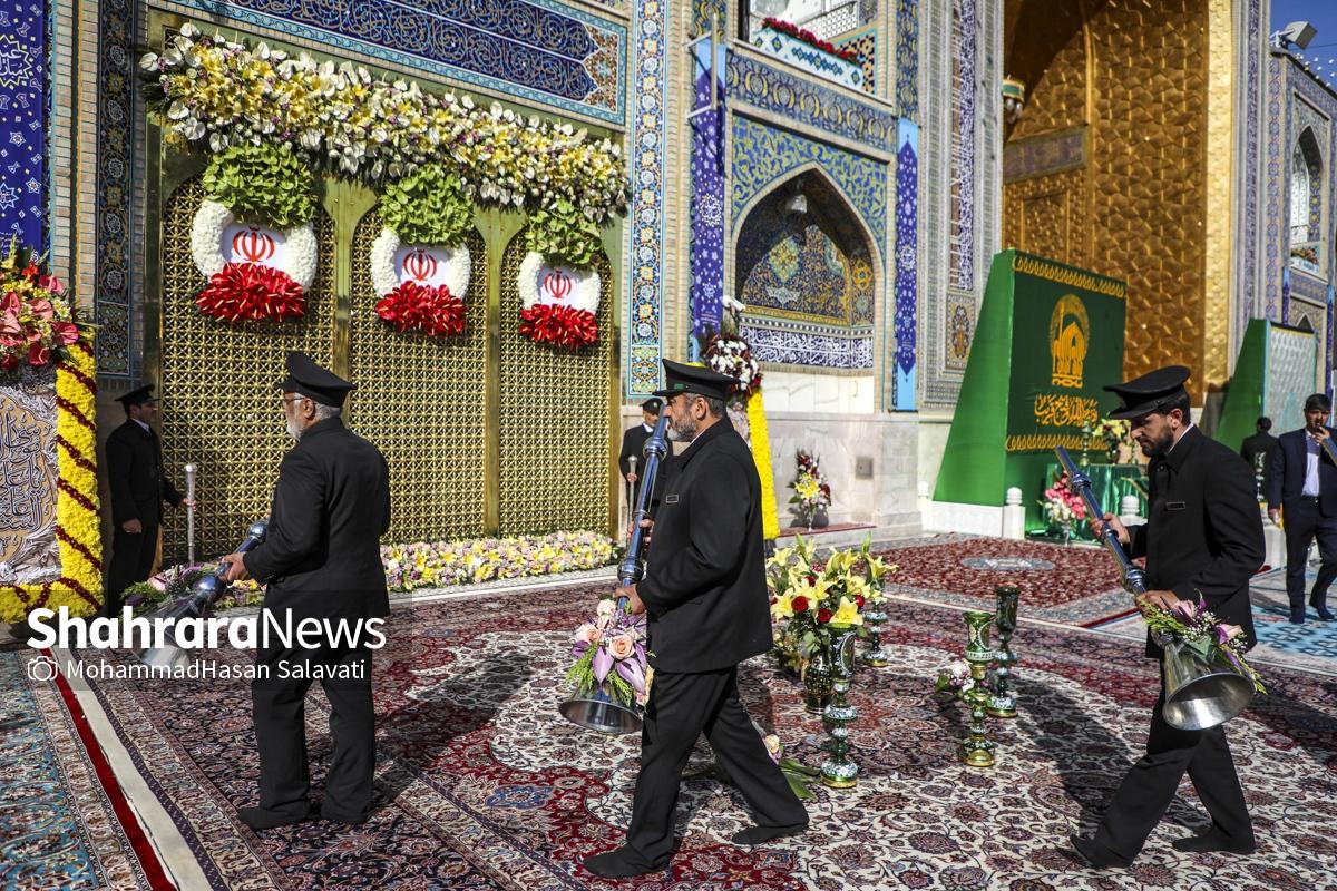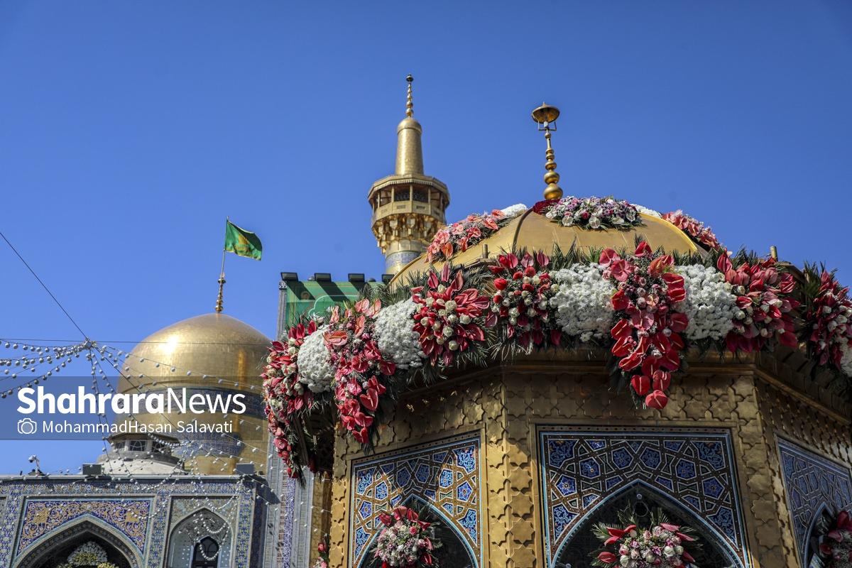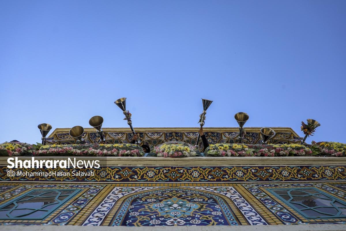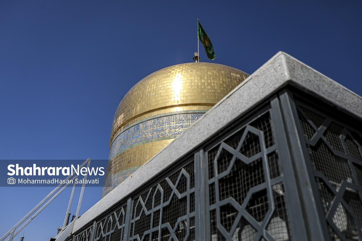 مراسم تعویض پرچم گنبد حرم مطهر ثامن الحجج (ع) صبح امروز (۹ اردیبهشت ۱۴۰۵) همزمان با سالروز ولادت آن حضرت با حضور جمع کثیری از خادمان، زائران و مجاوران بارگاه منور رضوی برگزار و نقارههای حرم مطهر نیز نواخته شد.