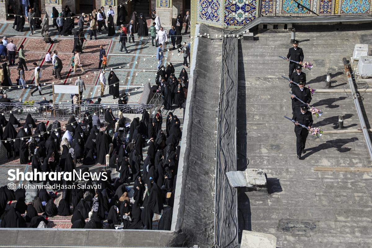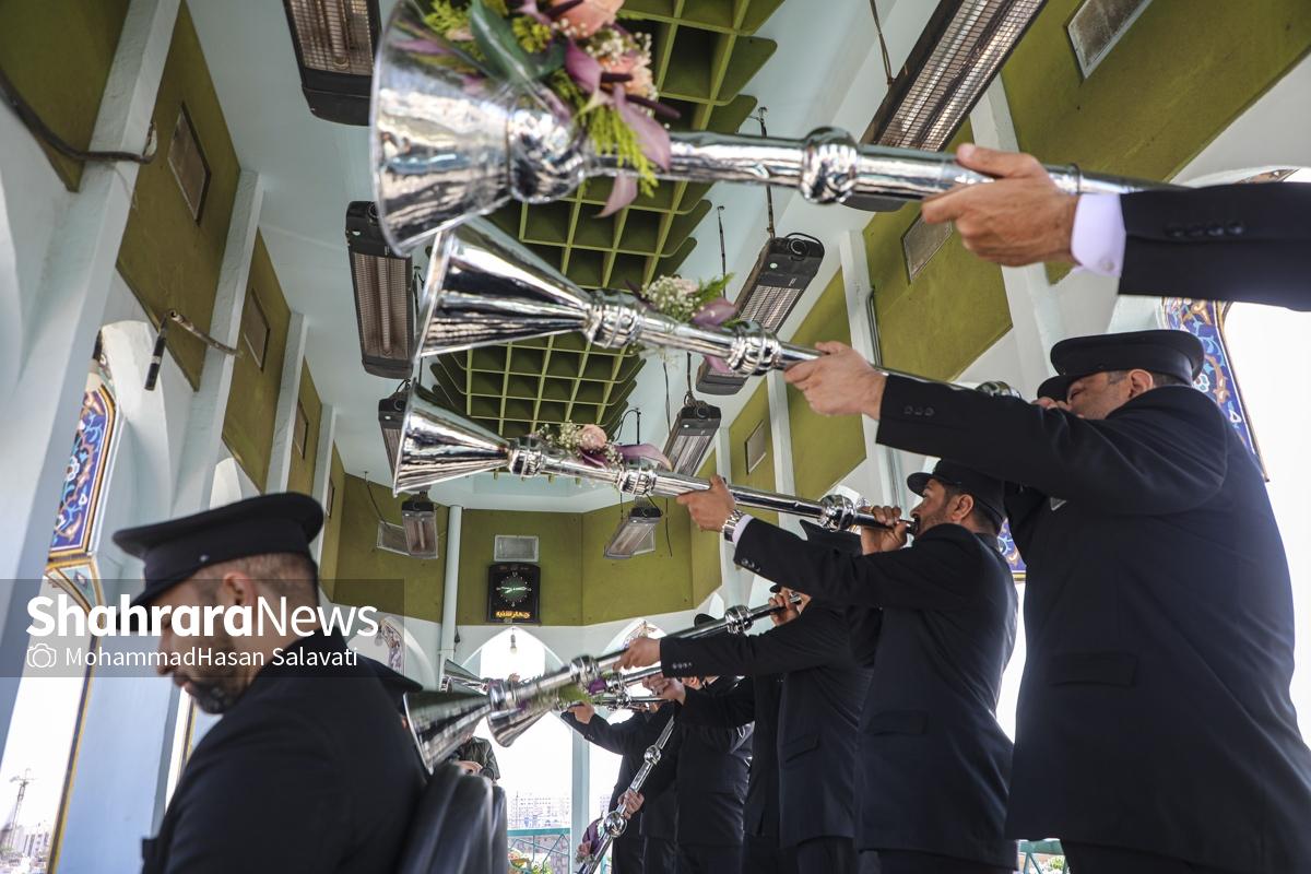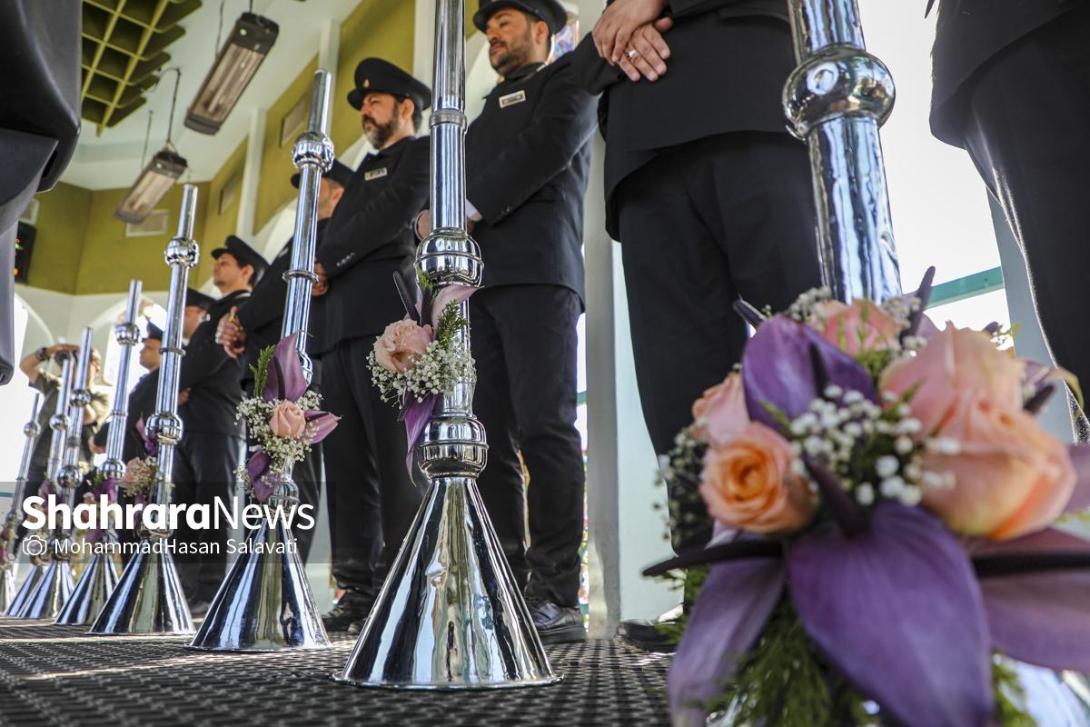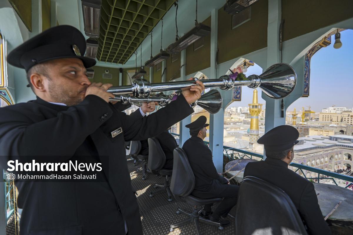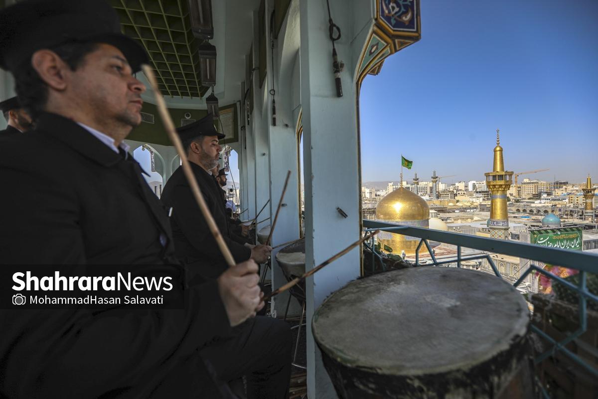 مراسم تعویض پرچم گنبد حرم مطهر ثامن الحجج (ع) صبح امروز (۹ اردیبهشت ۱۴۰۵) همزمان با سالروز ولادت آن حضرت با حضور جمع کثیری از خادمان، زائران و مجاوران بارگاه منور رضوی برگزار و نقارههای حرم مطهر نیز نواخته شد.