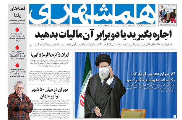 صفحه نخست روزنامههای کشور - پنجشنبه ۲۷ آذر ۱۳۹۹
