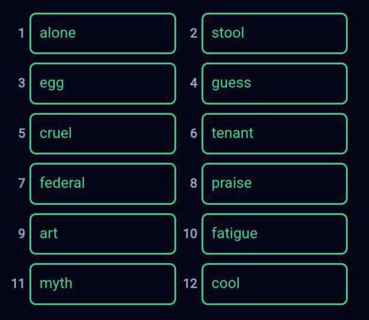 راکی ربیت، چالش روزانهای در قسمت انیگما (Enigma) خود قرار داده است. در این ایونت باید ۱۲ حروف رمز کیف پول خرگوشی خود را به ترتیب بچینید و برای یافتن چیدمان صحیح نهایی فقط ۳ بار فرصت خواهید داشت؛ اگر شما اولین فردی باشید که پاسخ درست را پیدا کرده است، ۲.۵ TON و ۲.۵ میلیون سکه جایزه میگیرید و در غیر این صورت فقط ۲.۵ میلیون سکه را دریافت میکنید. انیگما راکی ربیت هر روز ساعت ۱۹ و ۳۰ دقیقه آپدیت شده و رمز جدید کیف پول جایگزین قبلی میشود. در ادامه پاسخ معمای رمز کیف پول امروز راکی ربیت را خواهیم دید.